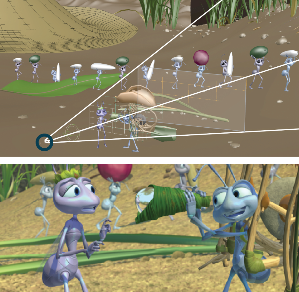Top: The camera placement (the blue circle) determines what the audience sees in this scene from A Bug’s Life.